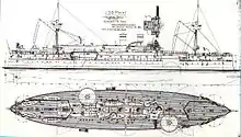 Maine is described as an armored cruiser or second-class battleship, depending on the source. Commissioned in 1895, she was the first U.S. Navy ship to be named after the state of Maine.[lower-alpha 1][1][2] Maine and the similar battleship Texas were both represented as an advance in American warship design, reflecting the latest European naval developments. Both ships had two gun turrets staggered en échelon, and full sailing masts were omitted due to the increased reliability of steam engines.[3] Due to a protracted 9-year construction period, Maine and Texas were obsolete by the time of completion.[3] Far more advanced vessels were either in service or nearing completion that year.