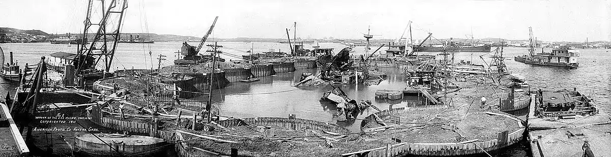 In January 1898, Maine was sent from Key West, Florida, to Havana, Cuba, to protect U.S. interests during the Cuban War of Independence. Three weeks later, at 21:40, on 15 February, an explosion on board Maine occurred in the Havana Harbor (23°08′07″N 082°20′3″W).[46] Later investigations revealed that more than 5 long tons (5.1 t) of powder charges for the vessel's six- and ten-inch guns had detonated, obliterating the forward third of the ship.[47] The remaining wreckage rapidly settled to the bottom of the harbor.