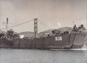 ![]() USS LST-938 entering San Francisco Bay, having just passed under the Golden Gate Bridge, as she returns from duty in the South Pacific, 27 May 1946 | |
