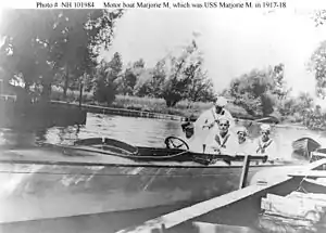 ![]() Marjorie M. as a private motorboat. The United States Navy officer and four enlisted men aboard her indicate that this photograph was taken around the time of her acquisition by the U.S. Navy in August 1917. | |