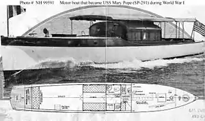 The U.S. Navy purchased Mary Pope from her owner, R. W. Bingham, on 7 July 1917[2] for World War I service as a patrol vessel. She was commissioned on 9 August 1917 as USS Mary Pope (SP-291).