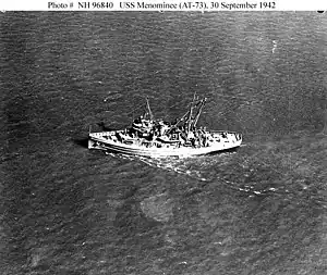 USS Menominee (AT-73) was a Navajo-class fleet tug constructed for the United States Navy during World War II.[1] Her purpose was to aid ships, usually by towing, on the high seas or in combat or post-combat areas, plus "other duties as assigned." During World War II she was assigned to the Asiatic-Pacific Theater where she participated in four campaigns earning four battle stars.