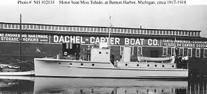 ![]() Miss Toledo as a private motorboat the shipyard of her builder, the Dachel-Carter Boat Company in Benton Harbor, Michigan, prior to her acquisition by the United States Navy. A U.S. Navy officer and at least one sailor are among the people standing on her deck. | |