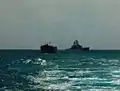 Mississippi deployed with the John F. Kennedy Battle Group to the Mediterranean for Operations Desert Shield/Storm (16 August 1990 – 28 March 1991). She escorted the carrier Theodore Roosevelt, which broke with her conventionally fueled battle group upon exiting the Suez Canal. These two ships travelled at flank speed the length of the Red Sea and through the Bab-el-Mandeb into the Gulf of Aden arriving on (15 January). The importance of that day and break-neck speed to arrive on it was due to uncertainty about Yemen's position on the war, getting the carrier beyond shore batteries and short range patrol boats in the narrow straights was a priority before hostilities could commence on (16 January). Mississippi then waited off the coast of Yemen to escort the engine room troubled Nitro through the Bab-el-Mandeb (18 January) and out beyond the Gulf of Aden. As an ammunition ship, Nitro was needed for battleship shore battery and amphibious landing support. Once escort duty was complete Mississippi made flank speed to her launch position in the northern Red Sea. Mississippi fired three BGM-109 Tomahawk Land Attack Missiles (TLAMs) at Iraqi strategic and military targets (25 January 1991) and two more the following day. One Tomahawk failed after launch and landed in the sea after a short erratic flight. The ship then operated as the local anti-air warfare screen commander for the Red Sea Battle Force (27 January – 24 February).[2]