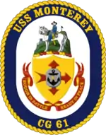 The coat of arms is emblazoned upon a white oval enclosed by a blue collar edged on the outside with gold rope and inscribed with the words USS MONTEREY above and CG61 below in gold letters.[14]