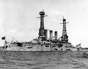 Ohio, the final member of the Maine class of pre-dreadnought battleships, was the second ship of the three to be laid down. She was built at the Union Iron Works in San Francisco, with her keel being laid on 22 April 1899. She was launched on 18 May 1901 and was commissioned on 4 October 1904.[2] After she entered service, Ohio was assigned as the flagship of the Asiatic Fleet. She left San Francisco on 1 April, bound for Manila in the Philippines. After the new battleship arrived, the party of then-Secretary of War William Howard Taft came aboard for a tour of East Asia, including stops in Japan and China. Ohio returned to the United States in 1907 and was transferred to the Atlantic Fleet. She and the rest of the Atlantic Fleet battleships held a naval review for President Theodore Roosevelt in Hampton Roads, Virginia to mark the start of the cruise of the Great White Fleet on 16 December 1907.[3] The cruise of the Great White Fleet was conceived as a way to demonstrate American military power, particularly to Japan. Tensions had begun to rise between the United States and Japan after the latter's victory in the Russo-Japanese War in 1905, particularly over racist opposition to Japanese immigration to the United States. The press in both countries began to call for war, and Roosevelt hoped to use the demonstration of naval might to deter Japanese aggression.[4]