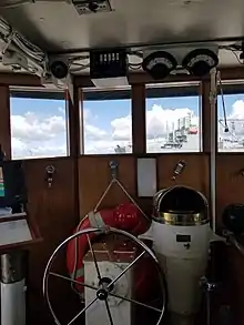 After being decommissioned, Potomac remained docked in Cambridge, Maryland and served with the Maryland Tidewater Fisheries Commission as one of forty fishery enforcement boats for the clam, crab, fish and oyster fishermen of the area until 1960.[7] To accommodate President Roosevelt's need for wheelchair accessibility, a concealed elevator had been installed inside what had been one of Potomac's smokestacks to carry the president from the main deck to the boat deck. This smokestack-elevator shaft was removed and now sits in Cambridge at Long Wharf park as a monument to the former president and his 1935 visit to Cambridge on the previous presidential yacht, USS Sequoia.[14]