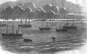 ![]() USS Sagamore (3rd ship from the right) at Ship Island base, | |