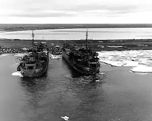 ![]() USS San Bernardino County (LST-1110) underway in a consolidated ice belt, northeast of Point Barrow, Alaska, during "DEW Line" support operations, 11 September 1955 | |
