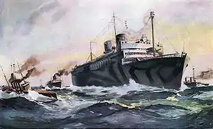 ![]() "Periscope" view of the Siboney in convoy, by Musician Loren C. Holmberg, USN (c. 1919), shows the dazzle camouflage applied to the ship during World War I. | |
