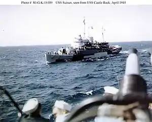 Suisun departed Saipan in the Marianas on 20 April 1945 and anchored at Kerama Retto in the Ryukyu Islands, on 25 April 1945. She tended seaplanes until forced to leave for Saipan to pick up emergency aviation supplies on 15 June. She returned to Kerama Retto on 26 June 1945 and resumed seaplane tending operations there through the cessation of hostilities with Japan on 15 August 1945, which brought World War II to a close.
