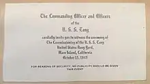 The contract to build USS Tang was awarded to Mare Island Naval Shipyard on 15 December 1941, and her keel was laid down on 15 January 1943. She was launched on 17 August sponsored by Mrs. Alix M. Pitre, wife of Captain Antonio S. Pitre, Director of Research at the Mare Island Naval Shipyard, and commissioned on 15 October 1943 with Lieutenant Commander Richard O'Kane, former executive officer of Wahoo, in command, and delivered to the Navy on 30 November 1943.[12]