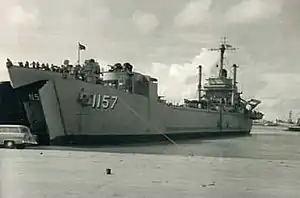 USS LST-1157 was designed under project SCB 9A, laid down on 3 March 1952 at Bath, Maine, by Bath Iron Works and launched on 6 December 1952, sponsored by Mrs. John H. Spiller. She was commissioned on 14 March 1953 with Lieutenant Commander L. I. Reynolds in command.