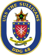 The dark blue and gold, on the shield of the coat of arms, represent the sea and excellence. They are also the US Navy's traditional colors. Red is emblematic of courage and sacrifice. The five interlaced swords honor the five Sullivan brothers killed in action during World War II and commemorate their spirit of teamwork and patriotism. The upright points of the swords allude to the present ship's combat readiness and her missile system. The border reflects unity and the eleven stars represent the battle stars earned by the first The Sullivans (DD-537); nine for World War II and two for the Korean War. The trident on the crest, a symbol of sea prowess, symbolizes DDG-68's modern warfare capabilities; the AEGIS and vertical launch system. The fireball underscores the Guadalcanal campaign where the five brothers were killed in action while serving on USS Juneau, and highlights the firepower of both past and present USS The Sullivans. The inverted wreath, a traditional symbol of the ultimate sacrifice, is also in memory of the Sullivan brothers. The shamrock recalls the Irish heritage. The arms, on the seal, are blazoned in full color upon a white oval enclosed by a dark blue collar edged on the outside with a gold rope and bearing the name "USS THE SULLIVANS" at the top and "DDG 68" in the base in gold.[19]
