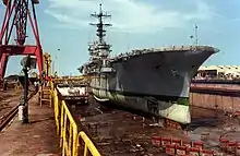 Tripoli was decommissioned in 1995 and as of 2004, she was on loan to the US Army, but remained laid up at Mare Island Naval Shipyard. In December 2006, the ship was towed to Pearl Harbor, Hawaii, where it had a high-tech role as a launch platform with the United States' developing ballistic missile defense program. Three times the ship was towed some 100 miles (160 km) off shore and used to launch small ballistic missiles, which were then intercepted by Terminal High Altitude Area Defense Missiles, test-fired from the Pacific Missile Range Facility. The last test in the series was performed 26 October, when the ship fired a "Scud-like" missile, which was successfully intercepted. The ship was towed back to the San Francisco Bay Area for the winter. As the Hawaiian island of Kaua'i lacked a suitable land-based launch site, and the costs of building one would far exceed the approximately $600,000 per year it costs to use the old warship, so the vessel returned to Pearl Harbor for a second series of tests in late spring 2008.[4] In March 2015, the ship was towed back through the Panama Canal and stored with the Beaumont Reserve Fleet.[5] In August 2016 the US Maritime Administration designated it for disposal.[6] In July 2018, Tripoli was towed from Beaumont to Brownsville, Texas, for scrapping by European Metal Recycling.[7]