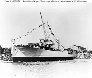 ![]() USS Chattanooga (PF-65) is launched at the Leatham D. Smith Shipbuilding Company shipyard at Sturgeon Bay, Wisconsin, on 7 August 1943, a year before she was renamed USS Uniontown just prior to commissioning. | |