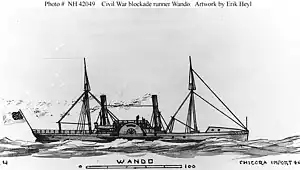 Wando was captured at sea off Cape Romain, South Carolina, by the Union side-wheel steamer USS Fort Jackson on 21 October 1864 as she attempted to slip away from the Confederate coast laden with cotton. The U.S. Navy purchased the ship from the Boston, Massachusetts, prize court on 5 November 1864, converted her into a gunboat, and commissioned her as USS Wando at the Boston Navy Yard on 22 December 1864, Acting Master Frederick T. King in command.