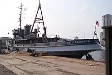 Prior to scuttling, parts of the Tamaroa were removed by the Black Dog Salvage company for two episodes of the TV show "Salvage Dawgs". Her main mast was repurposed as a flagpole for the Ballast Point microbrewery in Roanoke, VA. In 2017 the hull of the ship was scuttled off the coast of Cape May, New Jersey to add to an existing artificial reef. New Jersey and Delaware acquired the Tamaroa for $300,000, mostly raised through non-profit groups. It joins the Navy destroyer USS Arthur W. Radford 120 feet below the ocean’s surface on the Del-Jersey-Land Reef, which is managed by Delaware, New Jersey and Maryland.[1]