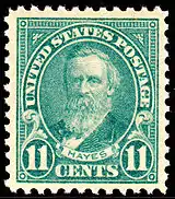 - Rutherford B. Hayes An 11-cent postage stamp was issued on the 100th anniversary of Hayes' birth, October 4, 1922, in Washington, D.C., and in Hayes' hometown, Fremont, Ohio, and marked the beginning of the regular issues in 1922. This is the first U.S. postage stamp to honor Hayes. The issue was designed by Clair Aubrey Houston. The engraving of Hayes is modeled after a photograph taken by prominent Civil War photographer Mathew Brady. John Eissler engraved Rutherford's image on the die for the vignette.[7]