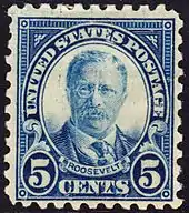- Theodore Roosevelt This is the first postage stamp to honor Roosevelt. It was issued on his birthday, October 27, 1922, in Washington D.C. and in his home town of Oyster Bay, New York. The stamp was commonly used on letters to foreign destinations with its blue color conforming to Universal Postal Union regulations for stamps used on foreign mail. Clair Aubrey Huston designed the stamp. The image of Roosevelt was engraved by John Eissler who modeled his engraving after a photograph taken of Roosevelt in 1907 by the Harris & Ewing firm in Washington, D.C.[5][7]