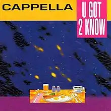 "U Got 2 Know" is a 1992 song by Italian Eurodance music group Cappella. It was successful in clubs and was re-released in 1993. In 1994, it was included on the group's second album by the same name. The single was a top 10 hit in Ireland and the UK, peaking at number seven and number six. On the UK Dance Singles Chart, it peaked at number one. It contains an uncredited interpolation of "Happy House" (1980) by British rock band Siouxsie & The Banshees and an uncredited vocal sample of "You Used To Hold Me" (1987) by Ralphi Rosario & Xaviera Gold.[1] Vocalist Anna Ross and rapper MC Fixx It (Ricardo Overman) were chosen by producer Bortolotti for live performances. Cappella was later sued by Siouxsie & The Banshees for failure to pay publishing royalties and lost.[2] In 2002, new remixes were released as "U Got 2 Know 2002".