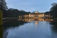 The forested area of Ujazdów closer to the river was designated by Stanisław II Augustus as a Baths Park (Polish: Łazienki), with a private palace obtained from nobleman Stanisław Herakliusz Lubomirski.[10] The chateau was reconstructed in a neoclassical style in the middle of a pond, earning it the names "Palace on the Isle" and "Palace on the Water". It is one of Warsaw's most recognizable landmarks.
