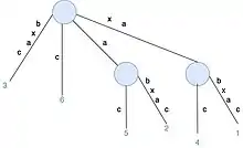 - Construct T3 for S[1...3] by adding suffixes of xab(xab,ab and b). Rule 1 applies, which extends the path label in existing leaf edge. Rule 2 applies, which creates a new leaf node.