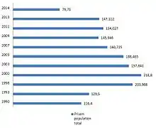 The country's prison system was the responsibility of the Ministry of Internal Affairs until 1998, when it was placed under the newly created State Penal Department. In December 2010 it was reorganized as the State Penitentiary Service of Ukraine, which is directed by the Ministry of Justice.[5] It is responsible for the execution of criminal sentences within the Ukrainian prison system. There are 177 penal institutions in Ukraine (for January 1, 2015 - 31 pre-trial detention prisons, 139 penal facilities of different levels of security, six corrective penal settlements for minors). On 1 January 2015, the prison population numbered 73,431 people (162 prisoners per 100,000 people, down from 347 per 100,000 people in July 2011).[6][7] Approximately one-sixth are remanded prisoners. The Department of Criminal Executive Inspection has 87,581 convicts who are sentenced to criminal punishments alternative to imprisonment. In February 2000, Ukraine abolished the death penalty, which had been abandoned since March 1997. 1,906 inmates are sentenced to life imprisonment. Development of the State Probation Service has begun.