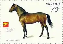 The Ukrainian Riding Horse (Ukrainian: украї́нський верхови́й кінь) or Ukrainian Saddle Horse is a modern Ukrainian breed of warmblood sport horse. Breeding began in the years after the Second World War at the stud farm of Dnipropetrovsk in central Ukraine – at that time in the USSR – and later expanded to three other state stud farms. It derives from cross-breeding of Hanoverian, Thoroughbred and Trakehner stallions with local mares or with Hungarian Furioso, Gidran Arab or Nonius mares. It incorporates the last bloodlines of the extinct Orlov-Rostopchin or Russian Saddle Horse.[5]:115 It was bred to compete in show jumping, three-day eventing and dressage, but is also suitable as a general riding horse.[6]:250
