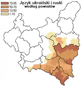 The Ukrainian minority in Poland (Ukrainian: Українці, Ukrayintsi, Polish: Ukraińcy) was composed of approximately 51,000 people (including 11,451 without Polish citizenship[2]), according to the Polish census of 2011. Some 38,000 respondents named Ukrainian as their first identity (28,000 as their sole identity), 13,000 as their second identity, and 21,000 declared Ukrainian identity jointly with Polish nationality.[3] In connection with the Russian invasion of Ukraine on 24 February, 2022, as part of the Russian-Ukrainian war, by 22 April, 2022, more than 5.2 million Ukrainian refugees left the territory of Ukraine, moving to the countries closest to the west of Ukraine, of which more than 2.9 million people fled to neighboring Poland.[4]