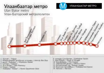 Ulaanbaatar Metro (Mongolian: Улаанбаатар метро) is a rapid transit system in the planning stages in Ulaanbaatar, Mongolia. The Ulaan Baatar Metro project was approved in 2012, and construction was originally planned to be completed by 2020, however, as of 2021 it is still not open.[1][2]