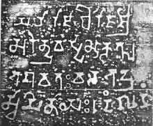 The Umachal rock inscription is one of the earliest epigraphic sources discovered in Assam. Dated to the 5th century, the rock description was discovered in the north-eastern slopes of the Nilachal Hills (called Umachal), near Guwahati city.[1] The artifact is dated primarily on the basis of the identification of the named Surendravarman with Mahendravarman (fl. c470-494) of the Varman dynasty.[2] The script is in the eastern variety of the Gupta script and the language is Sanskrit prose.[3] Though the Nilachal Hills is known for the Kamakhya Temple, a shakta/tantra site, this temple was for Balabhadra, a god of the Vaishnavite pantheon.[4]