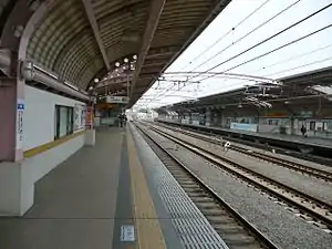 The station features four tracks and two side platforms. Express trains typically bypass the station on the two innermost tracks while local trains typically stop at the station on the two outermost tracks.