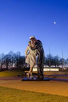 Unconditional Surrender is a series of computer-generated statues by Seward Johnson that resemble an iconic 1945 photograph by Alfred Eisenstaedt, V–J day in Times Square, but was said by Johnson to be based on a similar, less well-known, photograph by Victor Jorgensen that is in the public domain. The first in the series was installed temporarily in Sarasota, Florida, then was moved to San Diego, California and New York City. Other copies have been installed in Hamilton, New Jersey; Pearl Harbor, Hawaii; and Normandy, France. Johnson later identified the statue at exhibitions as "Embracing Peace" for the risqué double entendre when spoken.[1][2][3]