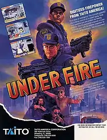 Under Fire[lower-alpha 1] is a light gun shooter released as an arcade game in 1994 by Taito. The game uses graphics created using digitized photographs and two player gameplay using gun controllers, similar to Konami's Lethal Enforcers. Unlike Lethal Enforcers, the controllers are not traditional light guns but rather operate using infrared technology. They also provide force feedback when the player pulls the trigger. The game was never released for home consoles.