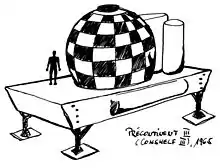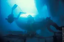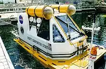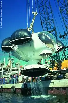 Launched for the first time in March 1978, this underwater shelter suspended in midwater (between 0 and 60 metres) is a mini scientific observatory 2.8 metres high by 2.5 metres in diameter.[45] The Aquabulle, created and experienced by Jacques Rougerie, can accommodate three people for a period of several hours and acts as an underwater refuge. A series of Aquabulles were later built and some are still being used by laboratories.[42][46]