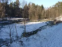 The Ungeheuersee was laid out towards the end of the Middle Ages or Early Modern Period as a drinking pool for cattle. It was first mentioned in the records in 1599.[1] The name has nothing to do with the German word Ungeheuer ("monster") but is derived from the words Unger for wood pasture and Heyer for enclosure.[2]