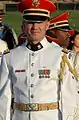 The white mess uniform is similar, but features a white mess jacket and black high-waisted trousers instead. The trousers are the same for all ranks.