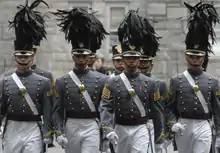 Spring parade dress consists of cadet grey swallow-tail coats with 21-gold buttons, a standing collar, white trousers, and black shakos (known as a "tarbucket hat" in U.S. Army nomenclature). Winter parade dress is similar to spring parade dress, though trousers are colored cadet gray instead of white. This same uniform is worn without the black shakos hat and with the gray or white peaked service cap depending on the season when not parading but still required for formal events. For evening formal events, no headgear is worn. Summer dress ("India Whites") consist of a white overblouse with a standing collar, white trousers and white peaked service caps. Service dress (“white over gray”) consists of grey trousers, short sleeve white shirts with shoulder boards, and white peaked caps. "Dress Gray" uniforms consist of gray blouses with a standing collar and trimmed with a one-inch black mohair braid band, gray trousers and gray peaked caps. In cold weather, a gray Long Overcoat is worn over the uniform. The daily service uniform ("As for Class") consists of gray trousers, charcoal gray shirts in long sleeve and short sleeve variants and garrison caps.[19]