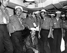 Service Dress Blues for male junior enlisted sailors are based on the classic sailor suit in navy blue, colloquially referred to as "crackerjacks" because of the sailor-suited figure that adorns the packaging of Cracker Jack snacks. They consist of a navy blue wool pullover jumper with a tar-flap collar adorned with three rows of white stripes on the collar and cuffs and two white stars, one at each corner of the collar. A black silk or synthetic fiber neckerchief, rolled diagonally, is worn around the neck, under the collar, with the ends tied in a square knot in the center of the chest. The trousers for the uniform are flared as "bell bottoms". The trousers have traditionally featured a broad-fall opening, though changes to the trouser announced in 2012 have added a zippered fly, rendering the buttons merely decorative.[5] A traditional white "Dixie cup" hat is also worn, as well as black leather shoes. For a brief period in the 1970s and early 1980s, male enlisted sailors in paygrades E-1 to E-6 wore a double-breasted blue uniform based on the version worn by officers and CPOs, but with grey buttons and a combination cover with an emblem consisting of a silver eagle and the letters "USN".[6]
