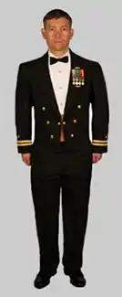 Dinner Dress Blue and White are identical to their Service Dress versions, but worn with miniature medals and badges with no ribbons. Dinner Dress Blue is additionally worn with a dress shirt and black bow tie. These variants are commonly worn by many junior officers and enlisted personnel as substitutes for the more formal Dinner Dress Jacket variant which is only prescribable for Lieutenant Commander and above and optional for Lieutenant and below.