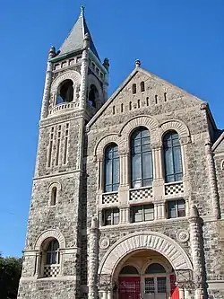 Union Methodist Episcopal Church, also known as Jones Tabernacle AME Church and Parish House, is a historic Methodist Episcopal church and parish house located in the North Central neighborhood of Philadelphia, Pennsylvania. It was designed by the noted Philadelphia architects Hazelhurst & Huckel and built in 1888–1889, of cut stone in the Richardsonian Romanesque-style. The church has an entrance archway with squat Syrian columns; and the building features a prominent front gable, chimneys, towers and pinnacles. The gable has a checkerboard pattern of stone and a Palladian window. The church interior is divided into two principal levels, a first floor Sunday School, and the second floor sanctuary with balcony. In the 1930s, the church was sold to Jones Tabernacle AME Church, then under the leadership of Rev. Richard R. Wright, Jr., son of Richard R. Wright (1855-1947).[2]