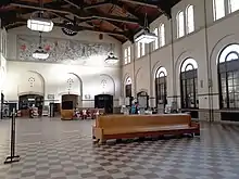 The construction of the current building was completed in 1924 in the Spanish Colonial Revival (also known as Early Christian/Byzantine) style and is built on the foundation of the earlier building.[3] It was dedicated on November 22 of that year, with a series of publicity shots being taken. One of these shots, showing 13 young women pulling the first train to arrive at the station by ribbons, made its way into the La Domenica del Corriere, an Italian newspaper, with the headline "Curious American Custom".[4] The ceiling of the Grand Lobby, taking up the center portion of the building, has a height of 56 feet and extends to the roof. The trusses were originally painted in bright colors with geometric designs, but have since been painted over with a faux wood grain. Murals of the construction of the Transcontinental Railroad were painted on the north and south end of the lobby. The second floors of the north and south wing were occupied by Southern Pacific, Ogden Union Railway & Depot Co., and Union Pacific Telegraph Department offices.[2]
