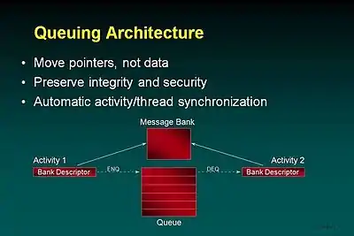 The queuing architecture is another interesting special case. It was specifically designed to allow very efficient handling of messaging where the number of messages waiting for processing could be almost unlimited. It is also aimed at reducing one of the primary costs of messaging, namely having to constantly move messages around in memory. Even moving them from the communication manager to the message queue subsystem to the processing program is eliminated. Instead each message is placed in a small bank of its own. Instructions allow placing the bank descriptors of these banks in a queue and removing them from a queue. When a message is placed in a queue, the sending program or subsystem no longer has any access to it. That bank is removed from its address space. When a message is retrieved from a queue, the bank becomes part of the receiver's address space. The queuing instructions also provide activity synchronization functions (e.g., wait for a message).