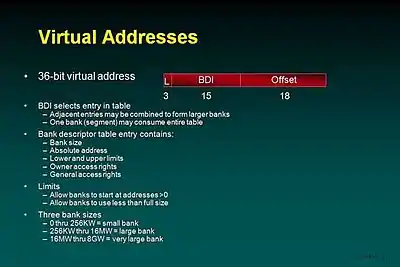 The BDI is simply an index into a Bank Descriptor Table. Each entry in the table contains information about a bank. Each such entry describes up to 1MB (256KW) of virtual address space. When a larger contiguous space is needed, consecutive entries are logically combined to create a larger bank up to the maximum of 230 words.