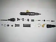 A unit injector (UI) is a high pressure integrated direct fuel injection system for diesel engines, combining the injector nozzle and the injection pump in a single component. The plunger pump used is usually driven by a shared camshaft. In a unit injector, the device is usually lubricated and cooled by the fuel itself.