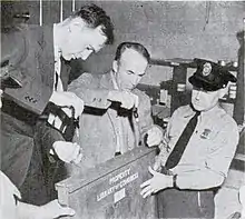 The first wave of gold shipments was made semi-weekly between January 11 and June 17, 1937, and overseen by the United States Post Office Department.[6][7] The gold was transported from the New York Assay Office and the Philadelphia Mint onto trains using postal trucks and municipal police escorts.[7] In the armored train cars, postal workers were accompanied by soldiers, secret service agents, and mint guards.[6][8] Decoy trains were employed.[7] The gold was transferred from trains onto Army trucks under the protection of soldiers armed with armor-piercing bullets and machine guns. The trucks were escorted by combat cars of the 1st U.S. Cavalry Regiment to the depository.[9] The Post Office Department billed the Treasury Department for transporting the weight of the crates and gold using the fourth class postage rate with added insurance fees.[6]