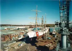 Since 1899, the United States Coast Guard Yard has built, repaired and renovated ships for the U.S. Coast Guard. It is the service's sole shipbuilding and major repair facility. The Coast Guard Yard was established on the shores of Arundel Cove off of Curtis Creek and Curtis Bay in south Baltimore, Maryland and neighboring northern Anne Arundel County.[3] In April, 1899, the former United States Revenue Cutter Service (RCS) leased 36 acres (150,000 m2) of farmland surrounding Arundel Cove. Two months later, Lieutenant John C. Moore, USRCS, arrived aboard the side-wheeler steamboat USRC Colfax to begin establishing a shipyard. Lieutenant Moore set up four small buildings including a lumber mill. The following year saw the arrival of the Salmon P. Chase, a training ship for the USRCS. The crew set up permanent quarters, marking also the beginning of the United States Coast Guard Academy. Five years later, in 1905, the United States Congress authorized the purchase of the land on which the depot sat and with additional surrounding properties ending the previous leasing arrangements. Throughout its first decade, the depot repaired many lifesaving boats, constructed a variety of small boats, conducted overhauls and painted USRCS cutters.[3][4]