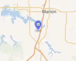 USP Marion in Southern Illinois is approximately 9 miles (14 km) south of the city of Marion, Illinois, 300 miles (480 km) south of Chicago, and 120 miles (190 km) southeast of St. Louis, Missouri.[2]