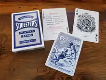 Squeezer brand cards were originally printed by the New York Consolidated Card Company. The New York Consolidated Card Company, Andrew Dougherty and Standard Playing Card Company were all eventually bought out and merged to form the Consolidated-Doughterty branch of the USPCC. Squeezer playing cards are printed with the Cambric Finish of Bee playing cards. Squeezer playing cards traditionally came in several back designs, but only the two most popular (the famous Bulldog and Angel Back) are still printed. Unlike most other USPCC cards, these cards are only printed occasionally.[18]